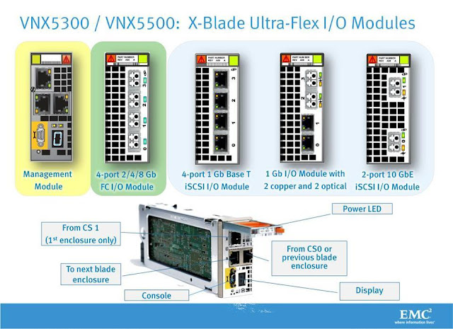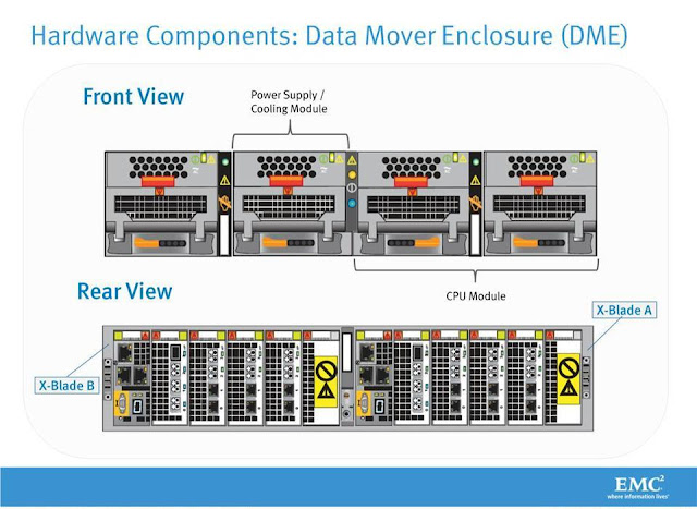 Data Mover выполнен в том же корпусе, что процессорный модуль VNX (SPE) и процессорные модули Clariion или Celerra, унификация на лицо. В каждом DME (SPE) установлено 2 Data Mover и 4-ре блока питания. Блоки питания запитаны от разных входов - 1 и 3 от одного, 2 и 4 от другого, следовательно при отключении питания от одного из входов оба DM (SP) будут работать каждый от своего БП. Если достать 2 блока питания, то удастся извлечь сам контроллер и получить доступ к памяти. Если взглянуть сзади на DME, то видно (x-Blade B, слева на право): модуль управления, коммутируется на CS, модуль для подключения DME к DPE или SPE, модули расширения для блочного устройства. Платы Ultra - Flex I/O: