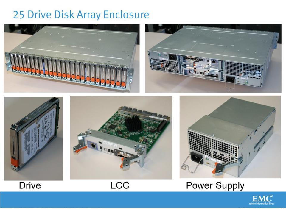5100 - только блочное устройство. В 5300 и 5500 для получения только блочного доступа необходимо использовать DPE (Процессорный модуль. В отличии от Clariion содержит диски) и SPS (источник(и) бесперебойного питания, который позволяет скинуть содержимое кеша на диски). В 5700 и 7500 вместо DPE используется связка из DAE (дисковой полки) и SPE, процессорного модуля без дисков. Так же, чем старше модель, тем мощнее процессоры. Например, VNX 5100 использует процессоры 1,6ГГц с двумя ядрами, а 5300 процессоры той же частоты, но уже с 4-мя ядрами. Если нужен файловый доступ, то необходимо добавить DME (Data Mover Enclousure) и Control Starion. DME используется для доступа к файлам и объектам, по сути это сервер x86 архитектуры, но в исполнении EMC. Содержит модули Flex I/O для добавления дополнительных интерфейсов. Control Starion - это сервер управления, применяется в случае файлового доступа. Представляет из себя обычный сервер x86 архитектуры с установленным Linux. Может быть установлена одна станция управления или 2 для избыточности. В случае выхода из строя CS, система не прекращает отдавать данные, но не доступно управление файловым доступом. Многие ругают EMC за использование "раздельной" архитектуры. Действительно не очень удобно использовать отдельные сервера для блоков, еще и какой то Control Starion. Гораздо проще все объединить в одной системе, как в VNXe. Но задумайтесь какую это сулит производительность и масштабируемость. Вы купили 7500 и вам не нужен файловый доступ? Не вопрос, покупайте Block Only, который занимает всего 5U с 25 дисками. Нужен доступ к файлам? Окей, еще плюс 3U для CS и DME. Мало производительности файловой части? Ну хорошо, еще плюс 2U для новых DME. Это очень гибко! Ну и 48 процессорных ядер для обработки файлов и объектов - немало! DPE в 5100, 5300 и 5500 спереди выглядит как полка с дисками. Только первые 4 диска отмечены желтой ленточкой - это операционная система массива - FLARE. Диски для неё называются - Vault. Стоит отметить, что не все пространство с этих дисков используется под ОС, "откусывается" 192ГБ с этих дисков. Остальное пространство вы можете использовать. Часто приходится натыкаться на споры относительно этих дисков и лично я считаю Vault недостатком, особенно для небольших систем. Но так уж сложилось, нужно просто помнить об этих дисках и планировать систему с их учетом. Мы нередко рекомендуем заказчикам устанавливать Vault диски SATA, на них можно хранить бэкапы или темплейты виртуальных машин, так тоже можно, но не все этим пользуются.